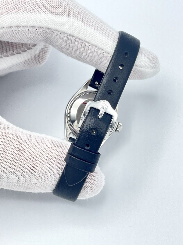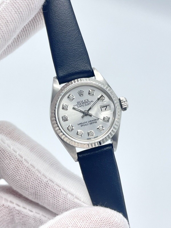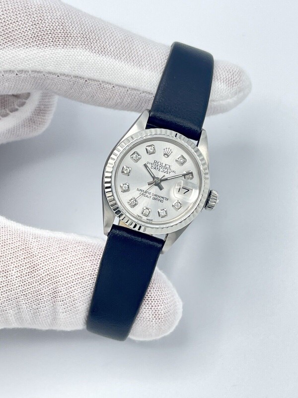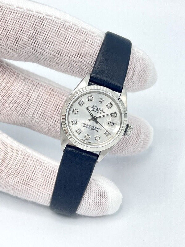 Rolex Datejust Ladies 26mm 6917 Silver Diamond Dial Fluted White Gold Leather