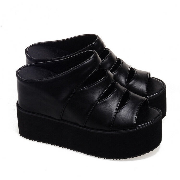 Womens Wedge Heel Black Slip on Shoes Summer Sandals Platform Open Toe Plus Size